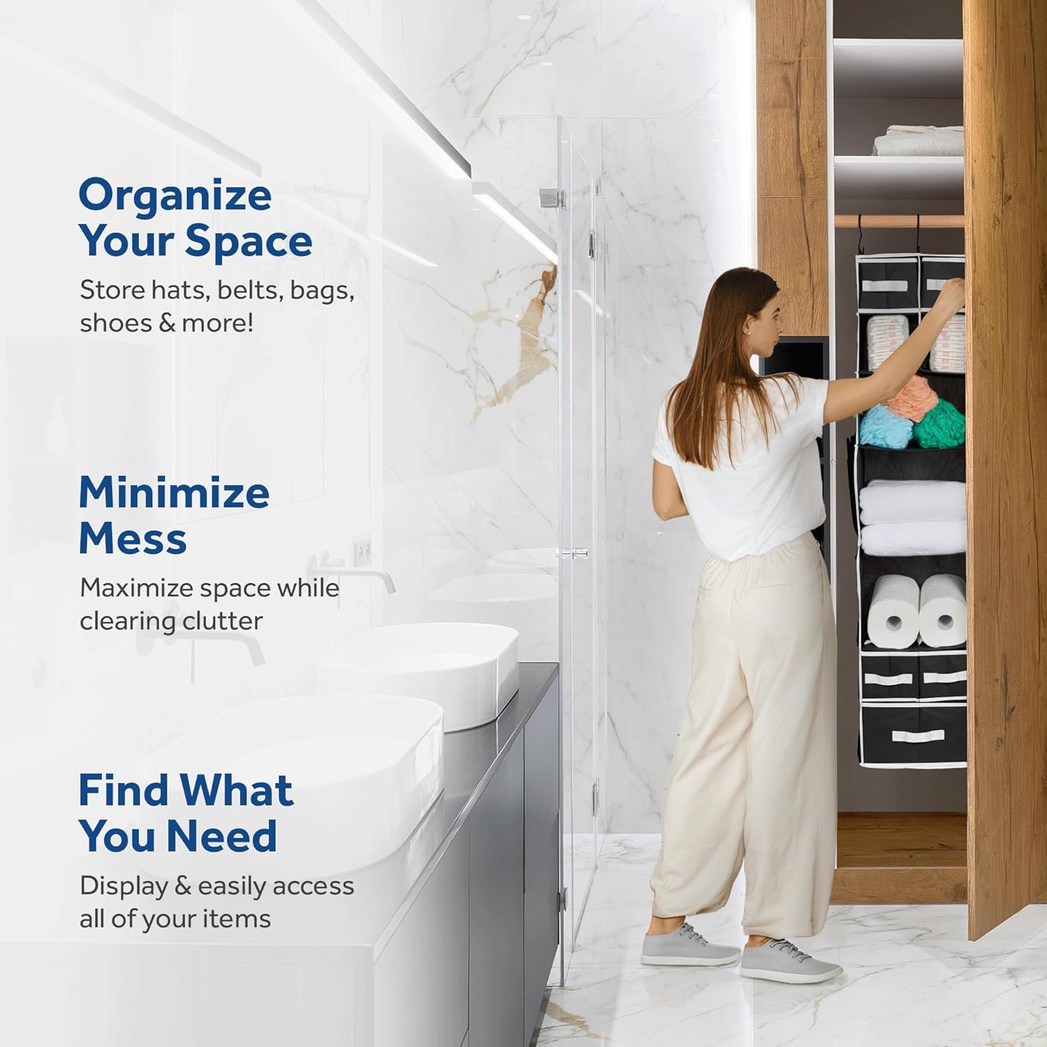- EASILY ACCESSIBLE - 2 Hangers are attached to the top of the organizer, so it doesn’t swivel. The entire front of the organizer is open, exposing the contents for easy access. Bins slide smoothly in and out with the sturdy handgrips and can be removed and carried from room to room.