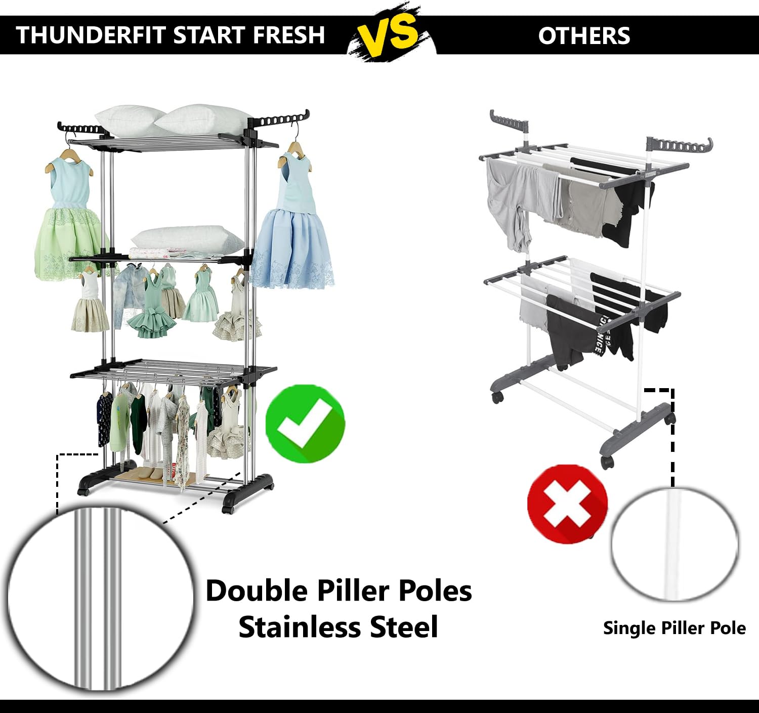 HEAVY-DUTY & FOLDABLE DESIGN – Built with thick stainless steel tubing and premium-grade plastic joints, this rack offers stability, reliability, and extended service life. Ideal for drying and organizing everything from kids' clothes to large blankets.